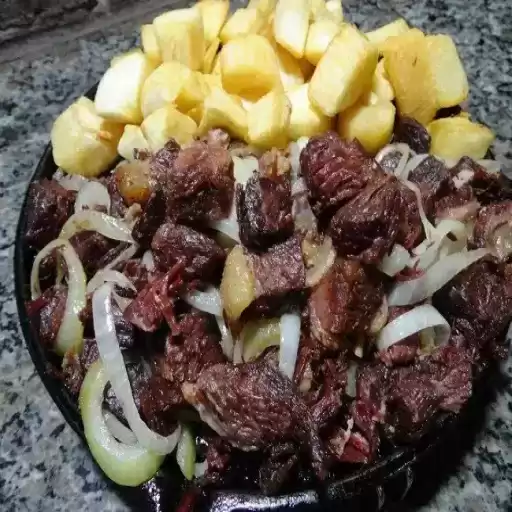Carne seca desfiada e temperada, acompanha mandioca frita