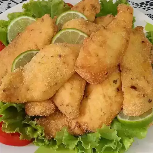 Merluza cortado em pedaços, empanado e frito - Acompanha molho da casa