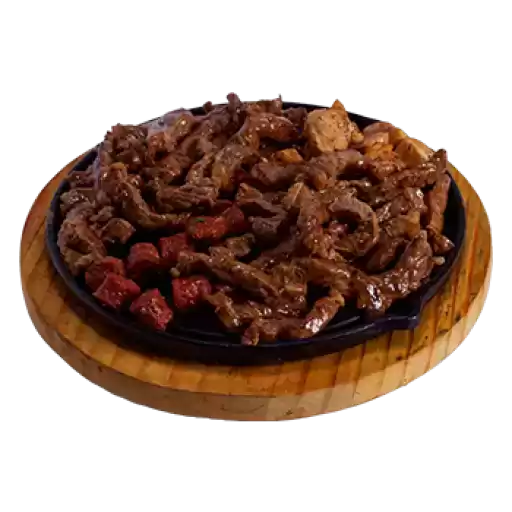 Arroz, Feijão, Fritas, Salada, Farofa, Carne (fraldinha) Frango e Linguiça.